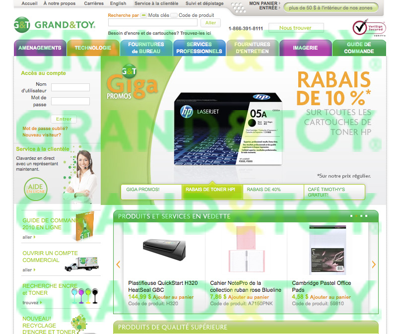 Grand & Toy is a large Canadian business-to-business office solutions company that has been around for over 130 years. OfficeMax, a global leader in office supplies, now owns the company. Took part in front end development and design for the new Grand & Toy corporate website (launched in late 2010) as well as graphic design work for the "G&T Big Deals" (English) / "G&T Giga Promos" (French) online campaign.